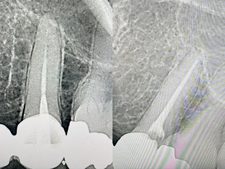 Case by Dr. Taha Azimaie: Retreatment of rootcanal through dental prosthesis can save patient money and dental visits. This tooth endodontically treated and was part of a dental bridge. The tooth also contained a long pin (AKA post) that is cemented deep in the canal, removal of a post is a challenging procedure and can lead to tooth fracture. In this case, an access hole made through the bridge and post removed. Root canal therapy retreated and the access hope filled with dental filling material. Now this dental bridge can last longer and may not require replacement.