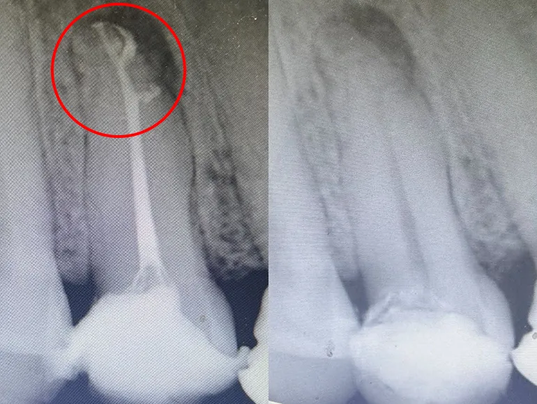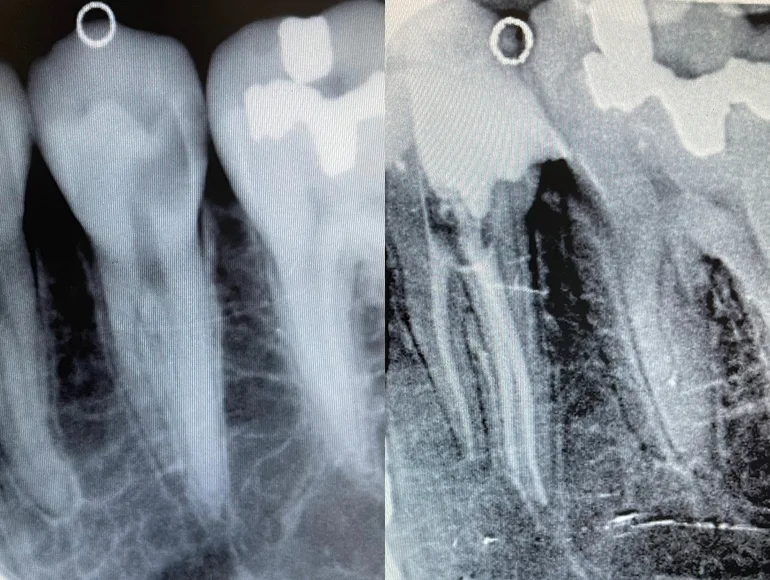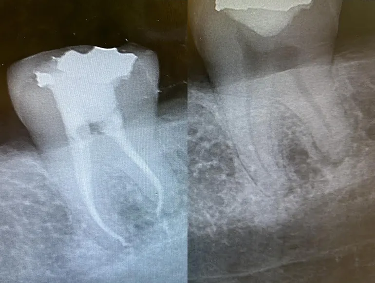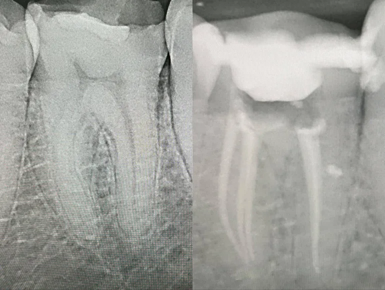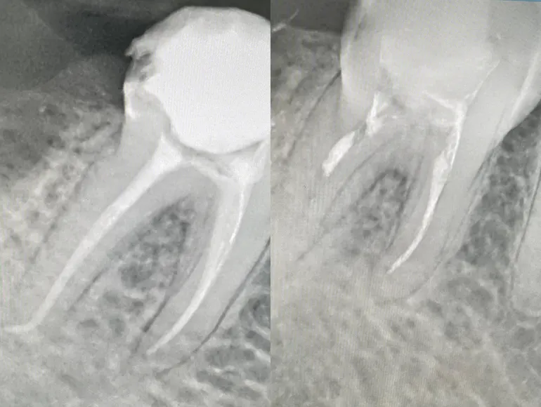 Case by Dr. Taha Azimaie: Retreatment of failed rootcanal can give a patient another chance to retain the tooth. Retreatment is case selective and not all failed rootcanals are treatable. In this case root canal has failed due to poor sealing of the canals (The white lines in the roots) during the first treatment. Please note the sharp deviation of the canal at the tip of the root (the white line)